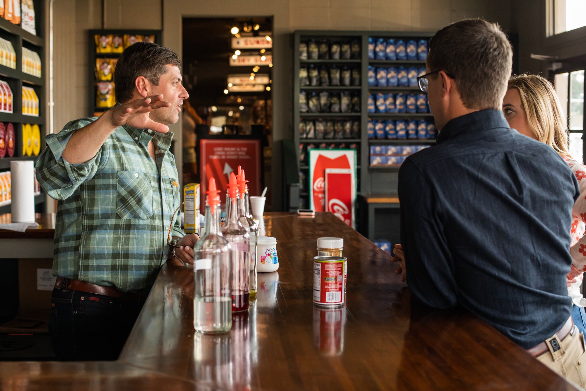 Josh shares, "The Scotsman General Store was an old feed store way back when. If you have ever been to an old feed store in the South, it's an assortment of different things. You can get feed for the cattle or chickens, but you can also get flour, popcorn, peanuts, and even hammers. You'd be able to get pretty much anything you would need for a farm. So when we opened the woodshop in the old loading area, we expanded our retail operations into our general store. We sell American Made products, like butcher blocks, flannels, tools, and things like that. We had all of this extra space that we could use, and Jim pointed out that visitors and locals need a place to sit down and enjoy a sweet treat, and he came up with a snowball stand."